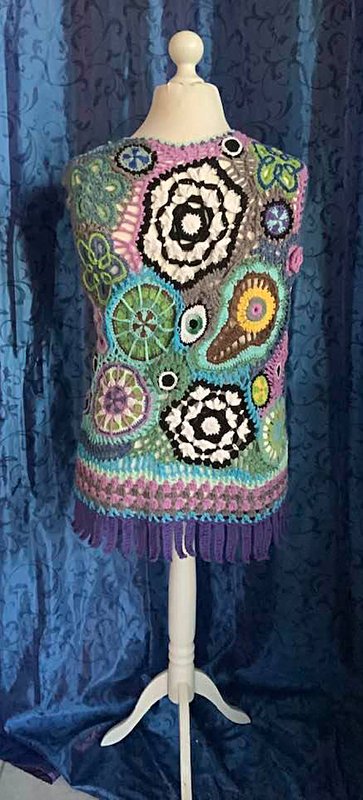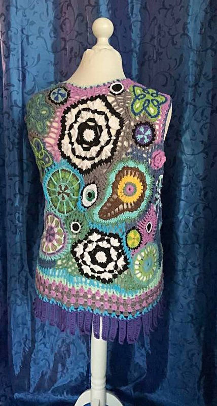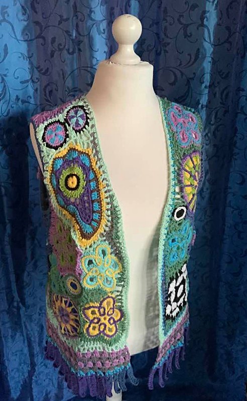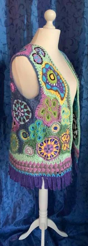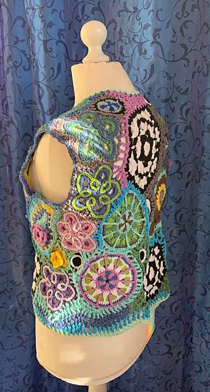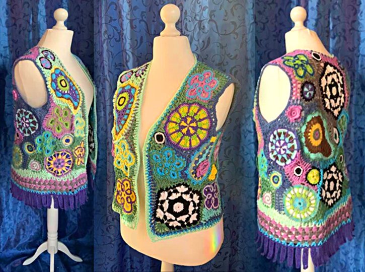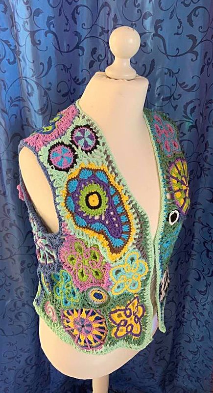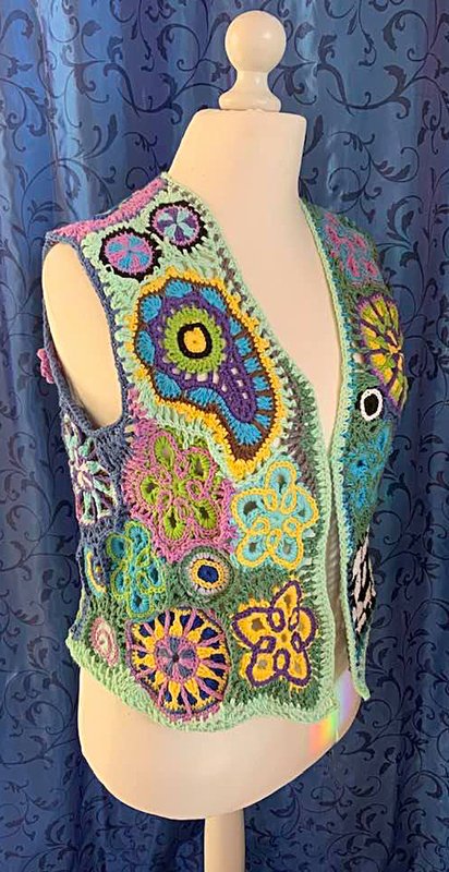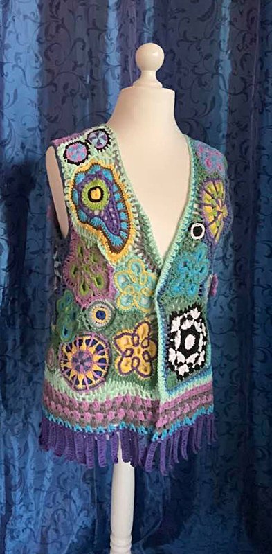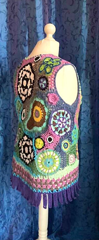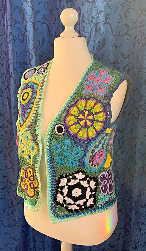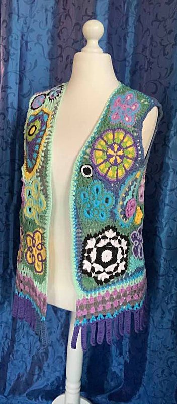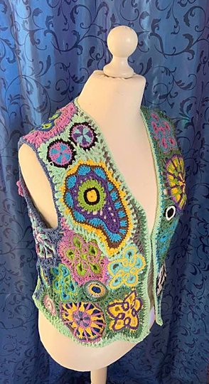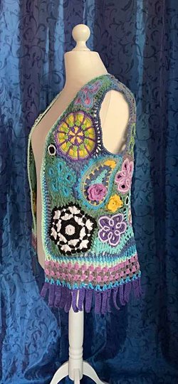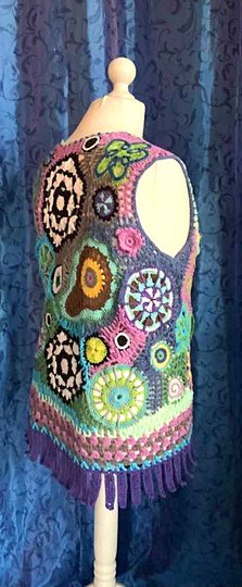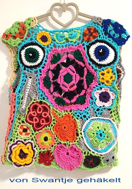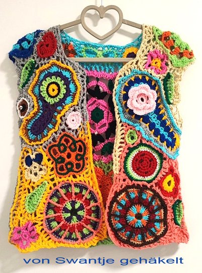 Diese Freestyleweste ist ein tolle Handarbeit, die viel Freude macht und immer so zwischendurch mal zu häkeln ist...sicher hast Du auch zu Hause schon viel Grannyversuche oder Blumen, die nur herumliegen...DIESE Versuche kannst Du natürlich auch noch in Deine Weste mit einbauen!