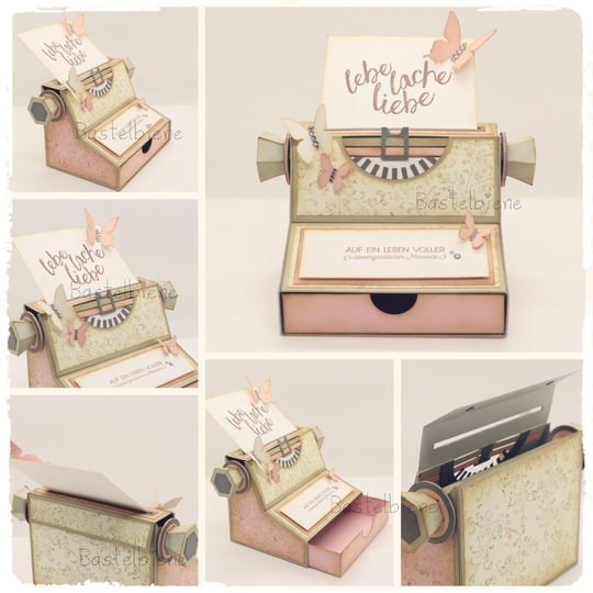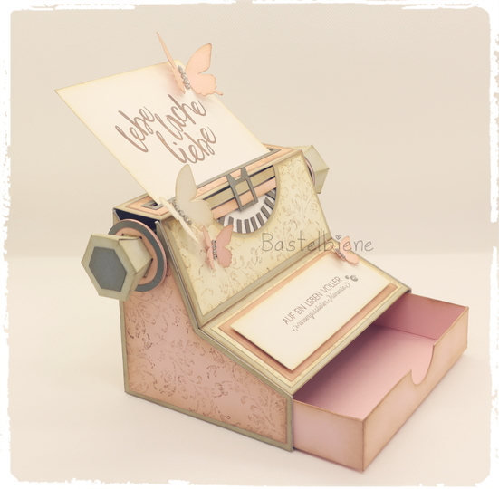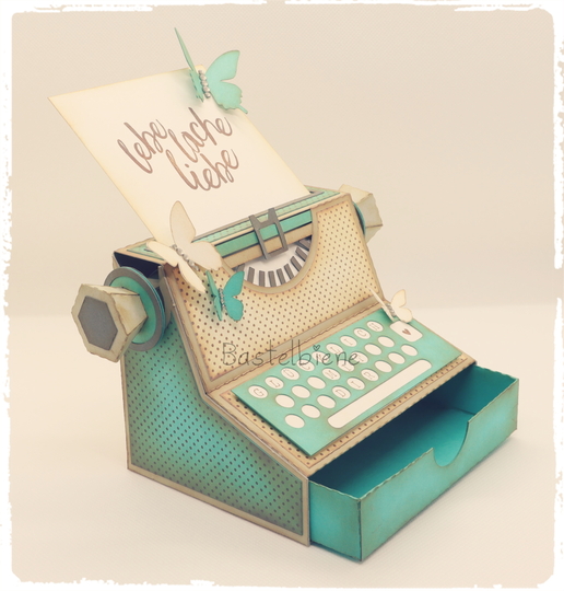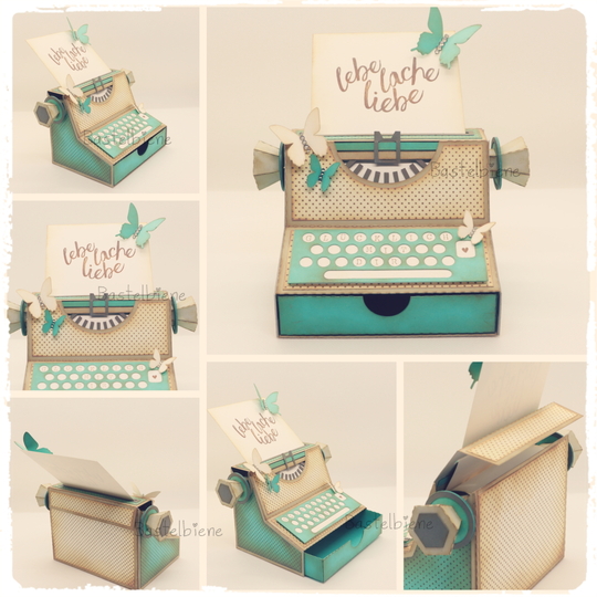 Eine PDF-Anleitung mit vielen Bildern und Tipps zum Basteln mit der Schere und allen Schablonen zum selber Zuschneiden. Dazu gibt es viele Tipps von mir, sodass auch Anfänger mit wenig Equipment diese Schreibmaschine basteln können.