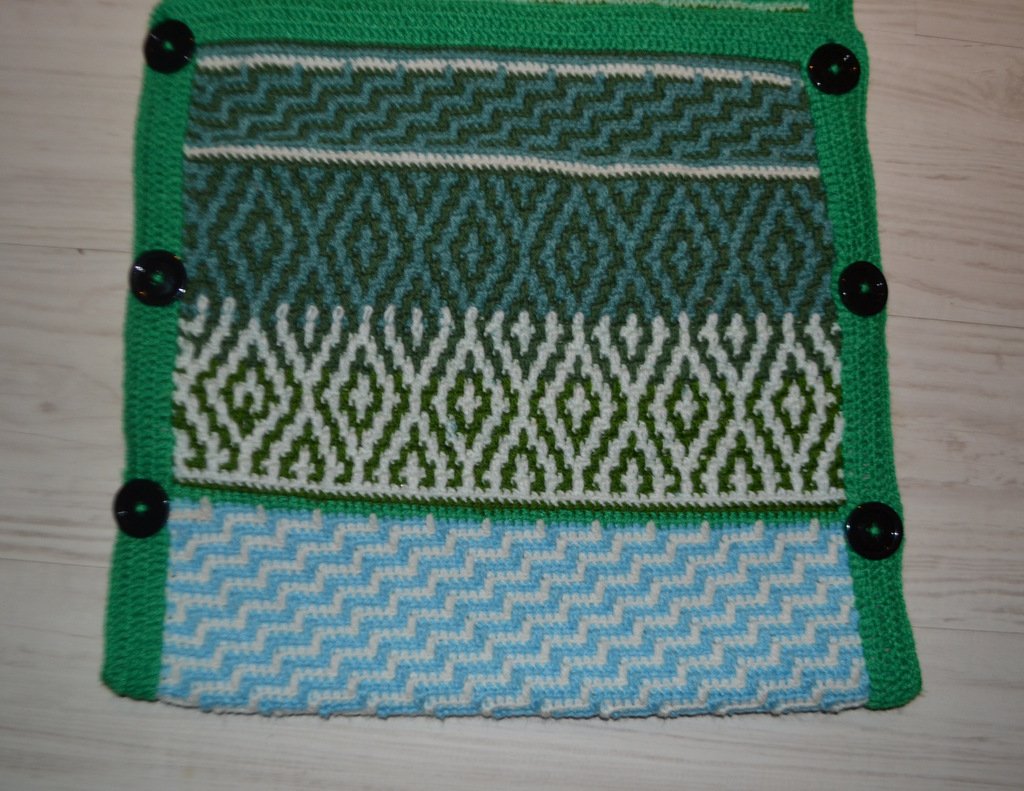 Häkeln: feste Maschen, die Mosaik-Technik ist in der Anleitung genau beschrieben und bebildert.