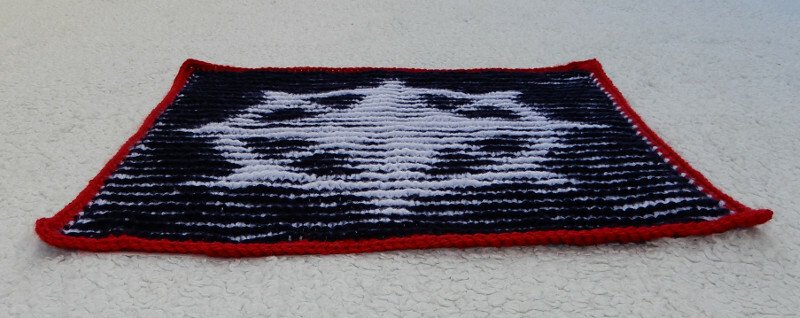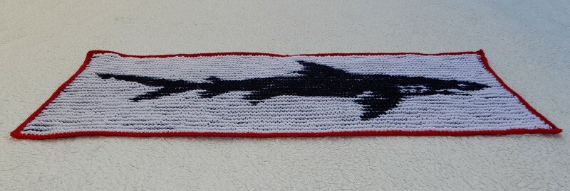 Für die Decke habe ich von Weiß und Marine jeweils etwa 450g gebraucht, für die roten Zwischenstreifen etwa 200g.