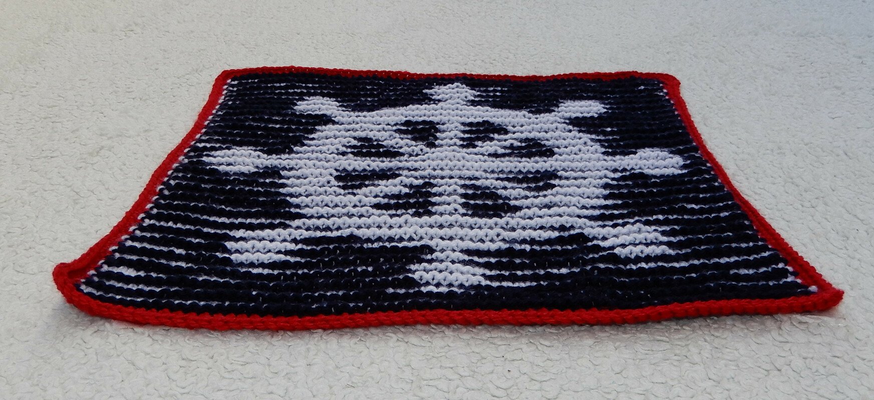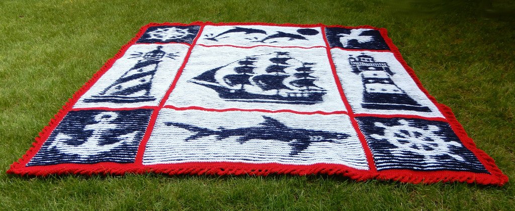 Die Decke "Nautik" ist in der Technik Illusionsstricken gearbeitet und besteht aus 9 einzelnen Motivblöcken, die zu einer Patchworkdecke zusammengehäkelt werden.