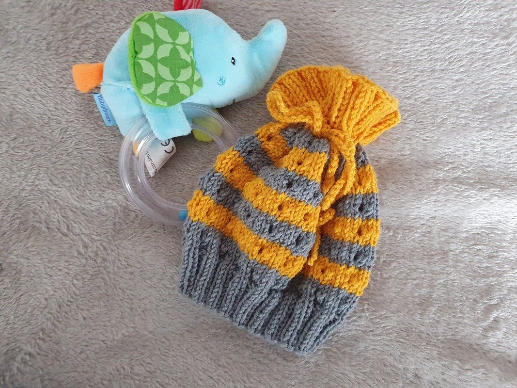 Diese niedliche Babymütze mit Lochmusterreihen ist bestimmt ein Hingucker bei der Ausfahrt an kühlen Tagen.
