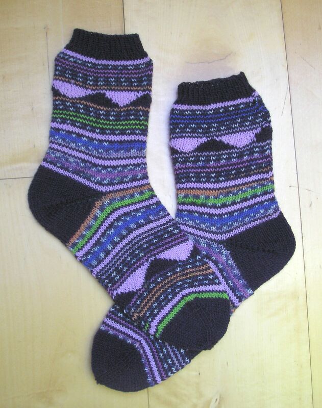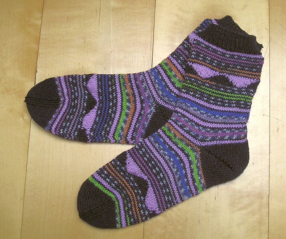 Die Socken werden mit 4-fädiger Sockenwolle gestrickt.Mit den Farben marine, flieder und einer bunten Wolle werden mehrere Streifen gestrickt. Es folgt ein Dreiecksmuster mit verkürzten Reihen. Danach geht es mit verschieden breiten Streifen weiter. Nach der Bumerangferse folgen weitere Streifen, nochmals das Dreiecksmuster.und noch ein paar Streifen bevor die Bandspitze gestrickt wird. Das Muster mit den verkürzten Reihen wird ausführlich textlich und mit einer Strickschrift erklärt. Alles andere ist kinderleicht und deshalb auch für alle, die schon Erfahrung mit Socken Stricken haben, gut zu bewältigen. Es ist eine gute Übung für den Umgang mit verkürzten Reihen.