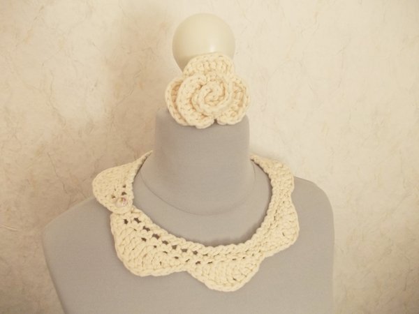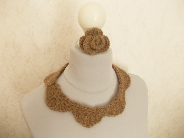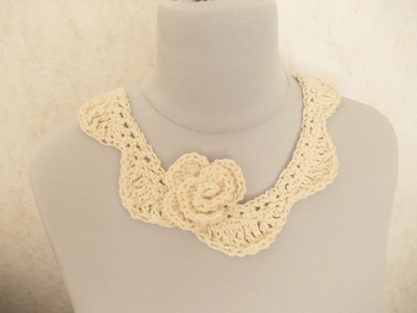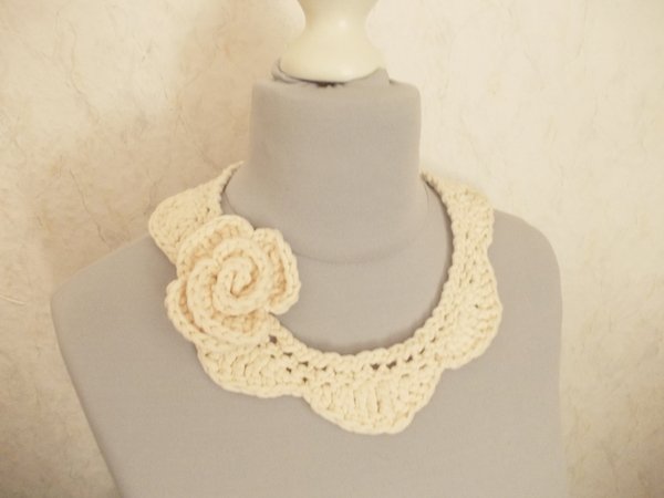 Dieser edle kleine Schal wird in einem "Stück" gehäkelt, kein Absetzen etc. Er besteht aus 7 Bögen, einer Rüschenkante und einer kleinen Schlaufe für einen Knopf oder eine Perle zum Schließen. Der Kragen/Schal kann auch rundherum mit Perlen verziert werden. Oder aber mit einer schönen Häkelrose verziert? Ich habe den Schal/Kragen hier schlicht gehalten, jedoch sind der Fantasie keine Grenzen gesetzt. Insgesamt ist der Schal 6 -7 cm breit (bis Spitze der Bögen).