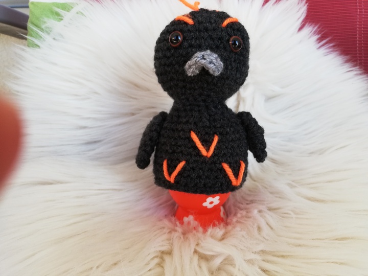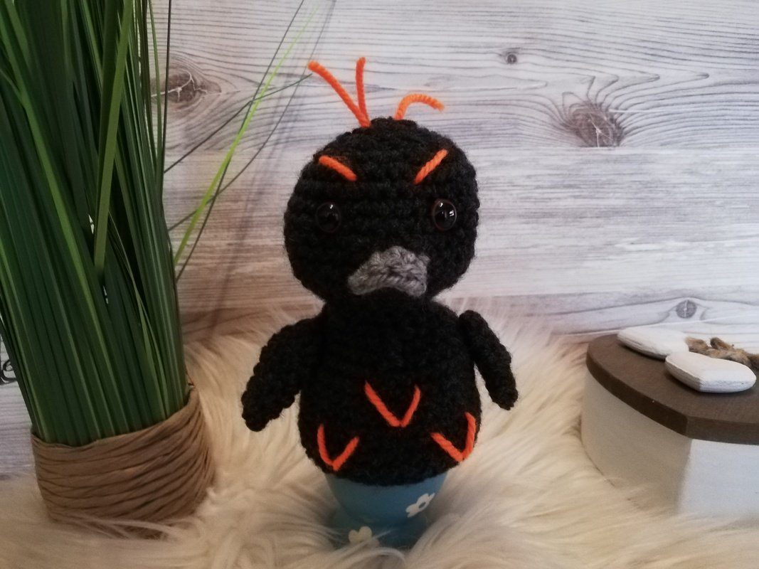 Der schräge Vogel wird ca 14 cm hoch und passt so hervorragend auf jeden Eierbecher.