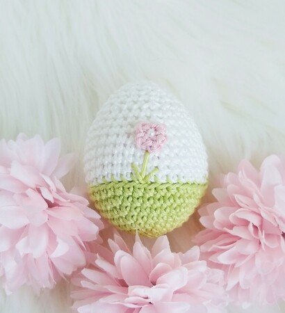 Häkelanleitung für ein zuckersüßes (Oster-) Ei mit Blümchen, gehäkelt aus festen Maschen.