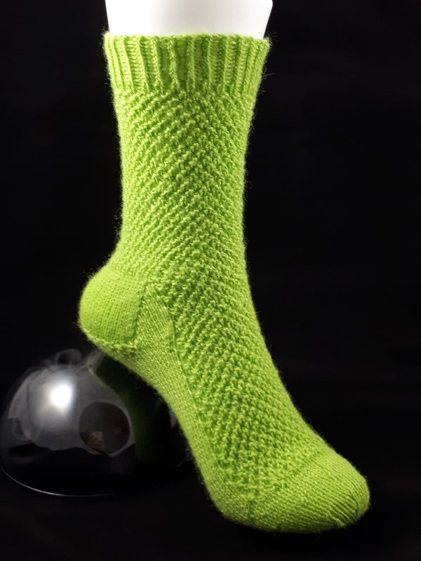 Die Socke wird mit Nadelspiel 3 mm gearbeitet und die Beispielanleitung passt Schuhgrößen 36-38.