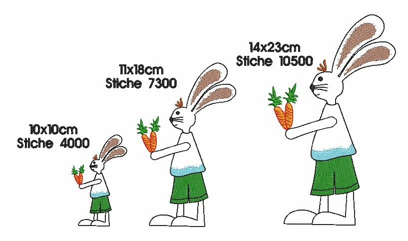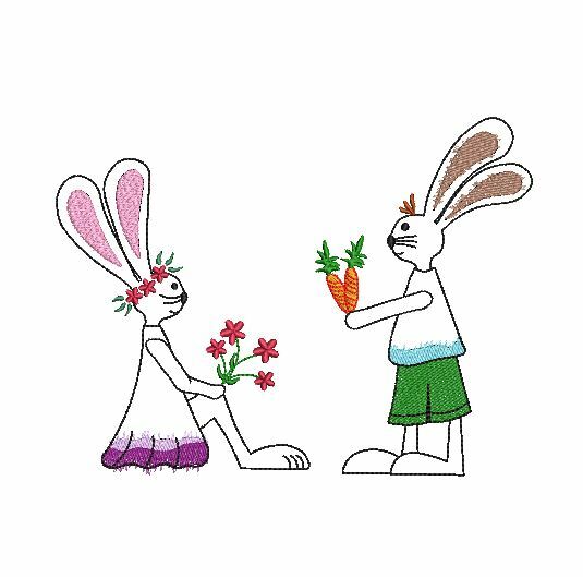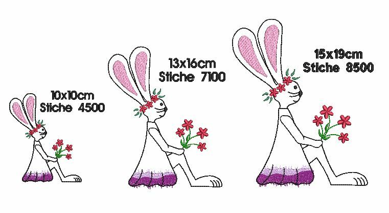 Hasen schnell gestickt im Konturstich, hinterlegt und ergänzt durch kleine bunte Flächen. Hasendame und Hasenjunge sind getrennt in jeweils 3 Größen gespeichert. Süße Deko auf Ostertaschen und vieles mehr.