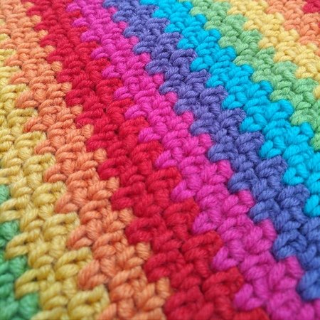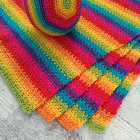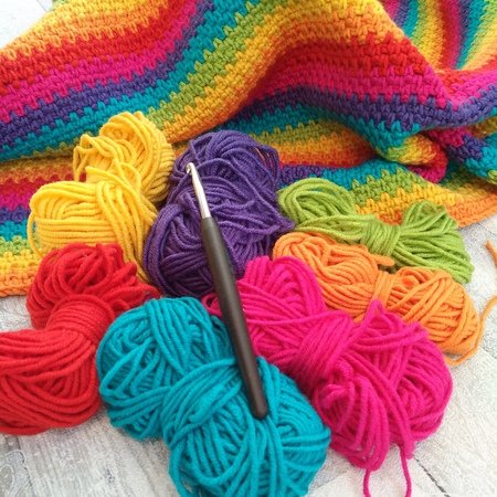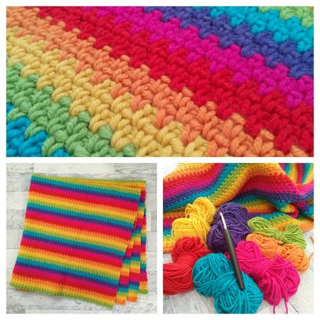 Die Regenbogen Babydecke habe ich aus einem weichen, pflegeleichten Wollgemisch gehäkelt.