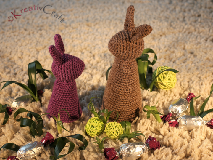 Bei einer Nadelstärke von 3 und dem angegebenen Garn wird der große Osterhase ca. 20 cm hoch. Die untere Öffnung hat einen Durchmesser von ca. 7 cm.