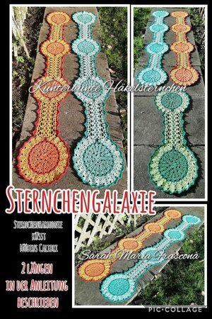 Bei der Sternchengalaxie handelt es sich um einen Sternchenläufer. Er kann unendlich lang gehäkelt werden. 2 verschiedene Längen werden in der Anleitung beschrieben. :)