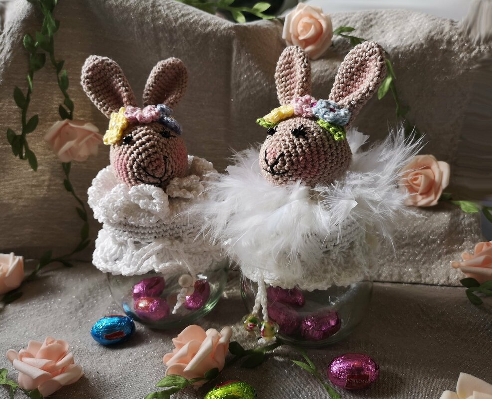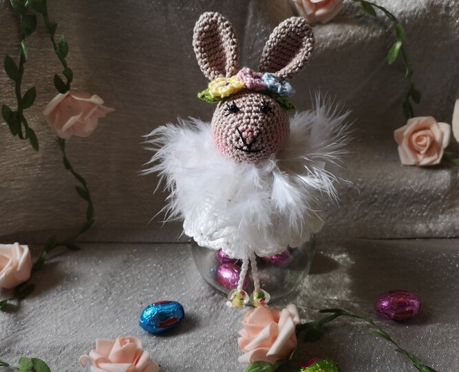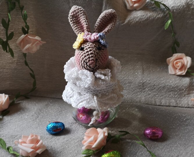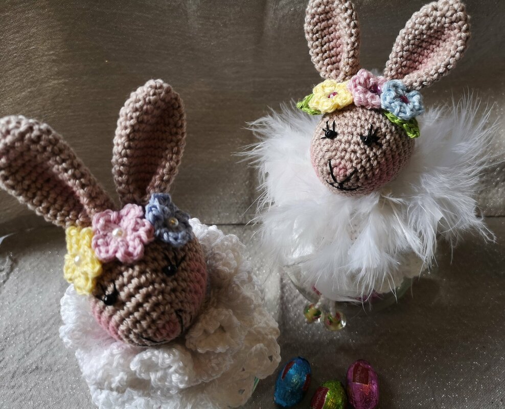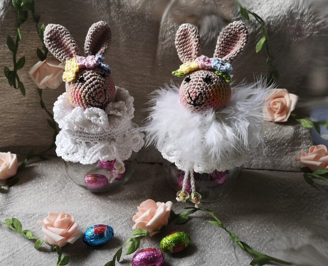 Mit dieser Häkelanleitung können Sie - nicht nur zur Osterzeit - einen niedlichen Deckelbezug anfertigen, auf dem ein kleiner Hasenkopf thront und keck aus seinem "Nest" hervorschaut. Ob als Vorratsbehälter für süße Leckereien, als Marmeladenglas für den Frühstückstisch, als Safe für Ihre Spargroschen oder mit einer kleinen Lichterkette darin als leuchtender Deko-Artikel - durch den Deckelbezug bekommt das Glas einen ganz besonderen Touch. So geschmückt verschönert es Ihr heimisches Ambiente, eignet sich aber auch hervorragend als kleines Geschenk für Ihre Liebsten. Viel Spaß wünscht Petras Häkelvergnügen.