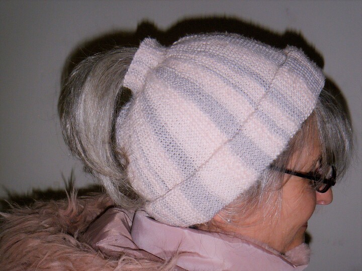 Der Umfang der Mütze wird beim Stricken an den Kopf angepasst und die Länge wird mittels Umschlagen passend gemacht.