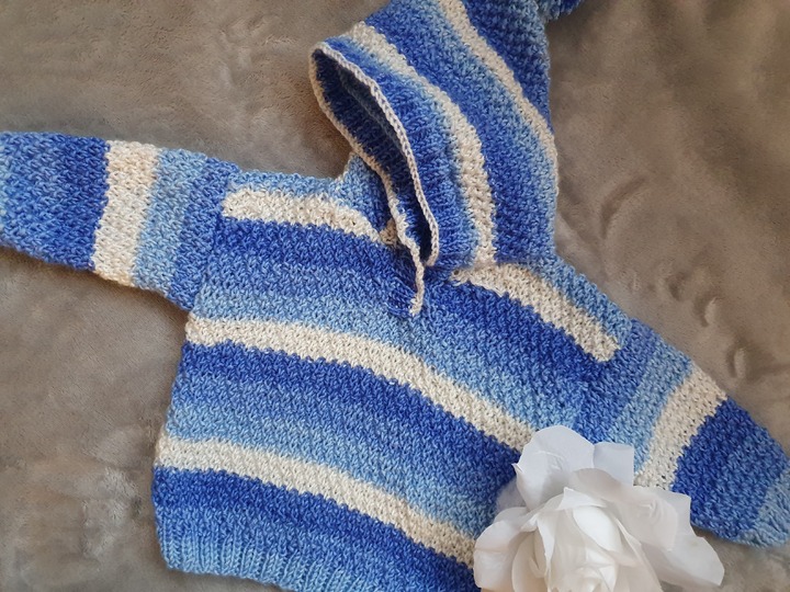 Der Kapuzenpulli wird nur in rechten und linken Maschen gestrickt, das Farbmuster ergibt sich aus der Wolle.