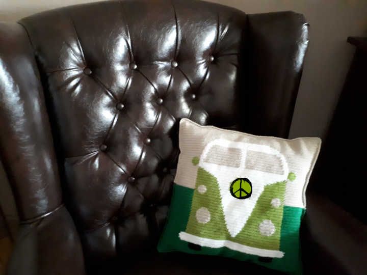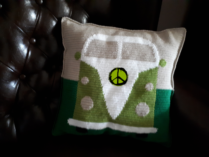 Dies ist eine Häkelanleitung für ein hübsches Kissen mit Retrobus-Motiv in der Größe ca. 40x40 cm.