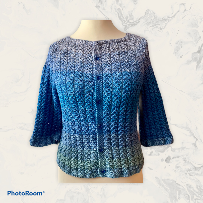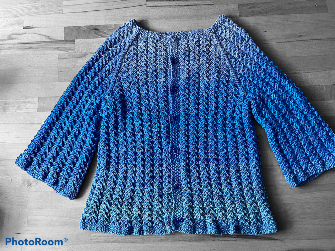 Dieses Jäckchen wird von oben nach unten in einem Stück in Reihen gestrickt. Die Ärmel mit passendem Farbverlauf werden aus den vorher stillgelegten Maschen in Runden gestrickt. Somit hast du am Ende keine Naht.