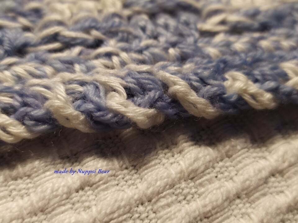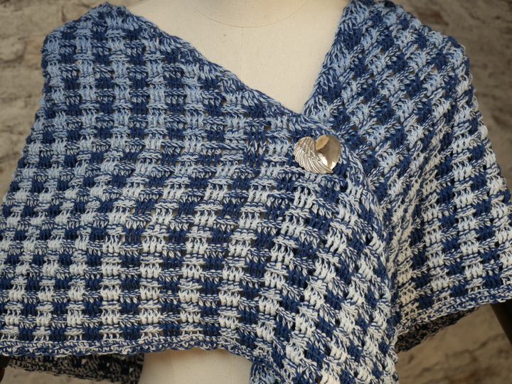 Mein Tuch "Wolkenspiel" besteht überwiegend aus vorderen und hinteren Reliefstäbchen. Gehäkelt wird es mit zwei Farben, was ein interessantes Musterbild ergibt. Je nachdem, ob mit