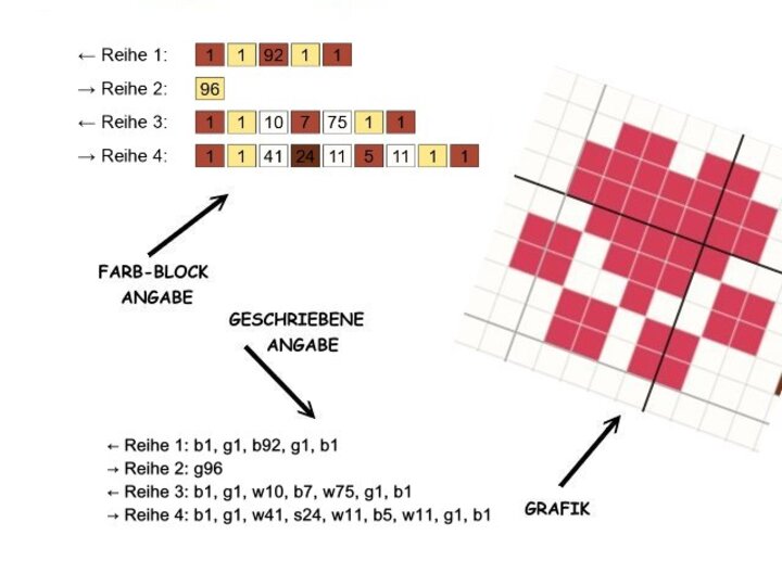 Die Grafik ist 95 Quadrate breit und 110Quadrate hoch und hat 7 Farben