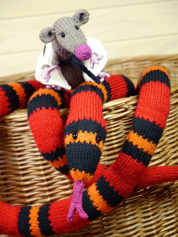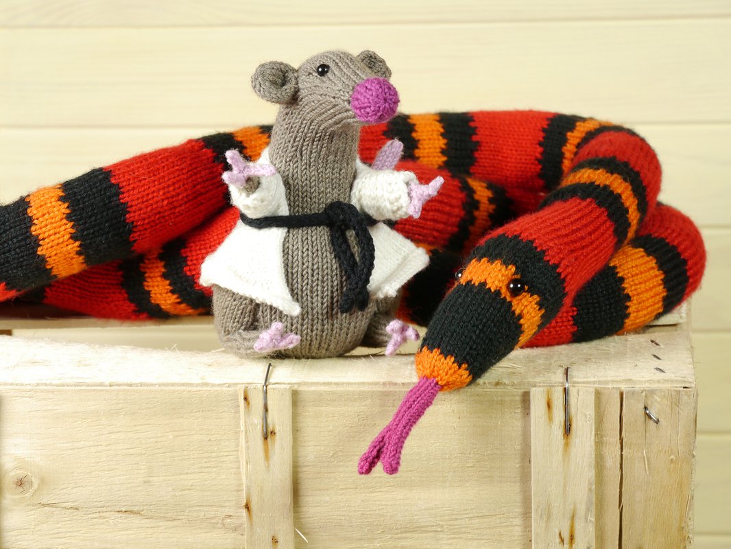 In diesem PDF finden Sie die Anleitungen sowohl für Rüdiger als auch für Chuck mit seinem coolen Karat(t)e-Matntel. Damit Rüdiger sich schön schlängelt, habe ich ihn mit verkürzten Reihen gestrickt, aber er kann natürlich einfach geradeaus gearbeitet werden – das ist dann leichter zu stricken, allerdings biegt er sich nicht so schön. Auch die Anleitung für den einfachen Rüdiger ist enthalten. Außerdem gibt es im Anhang detaillierte Erklärungen zu den spezielleren Stricktechniken. BITTE BEACHTEN SIE: Das Tier wird in RUNDEN gestrickt, es gibt keine Anleitung für das Stricken in Reihen!