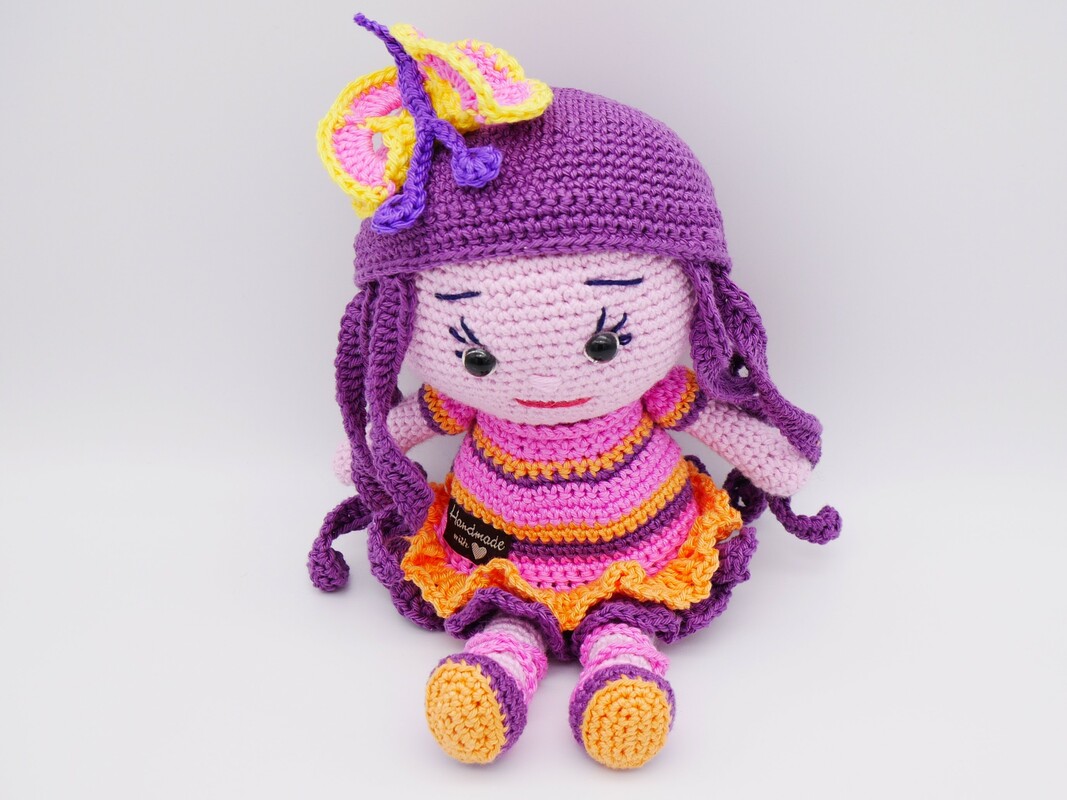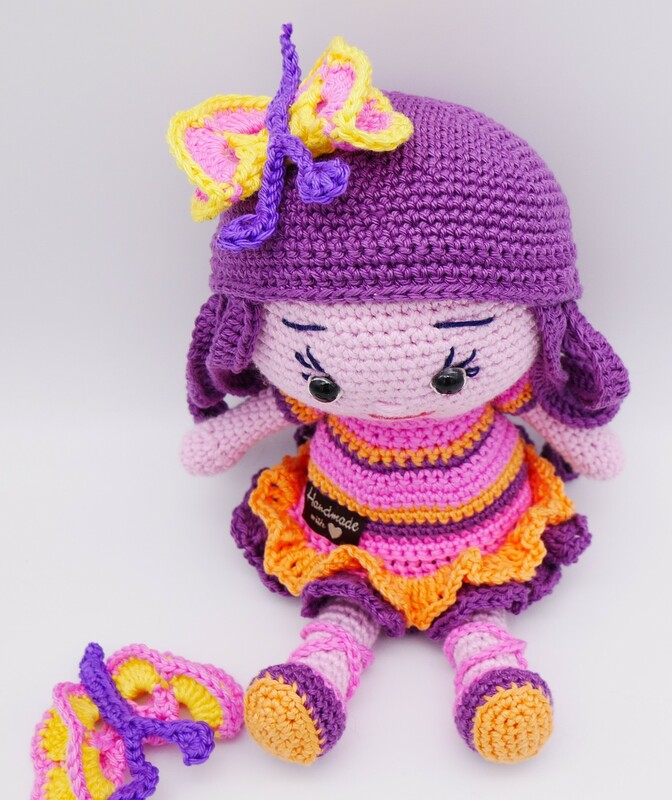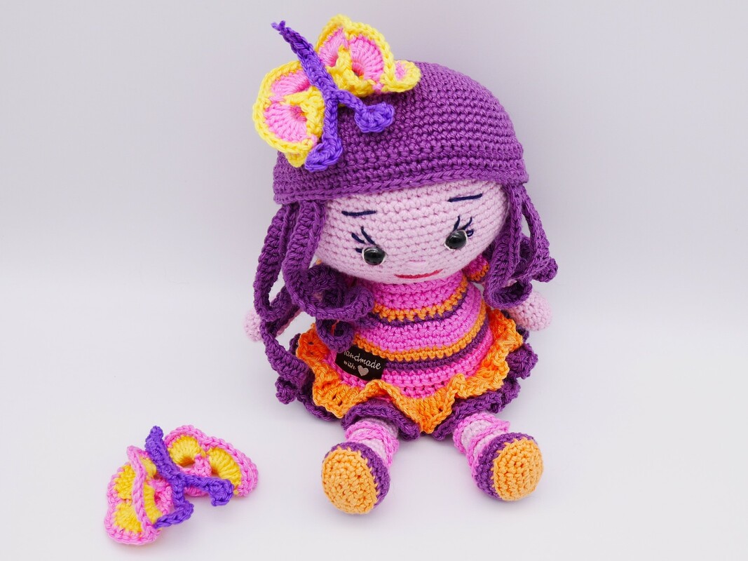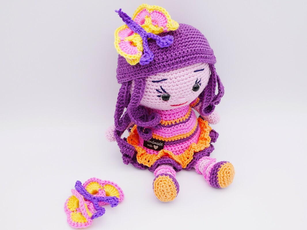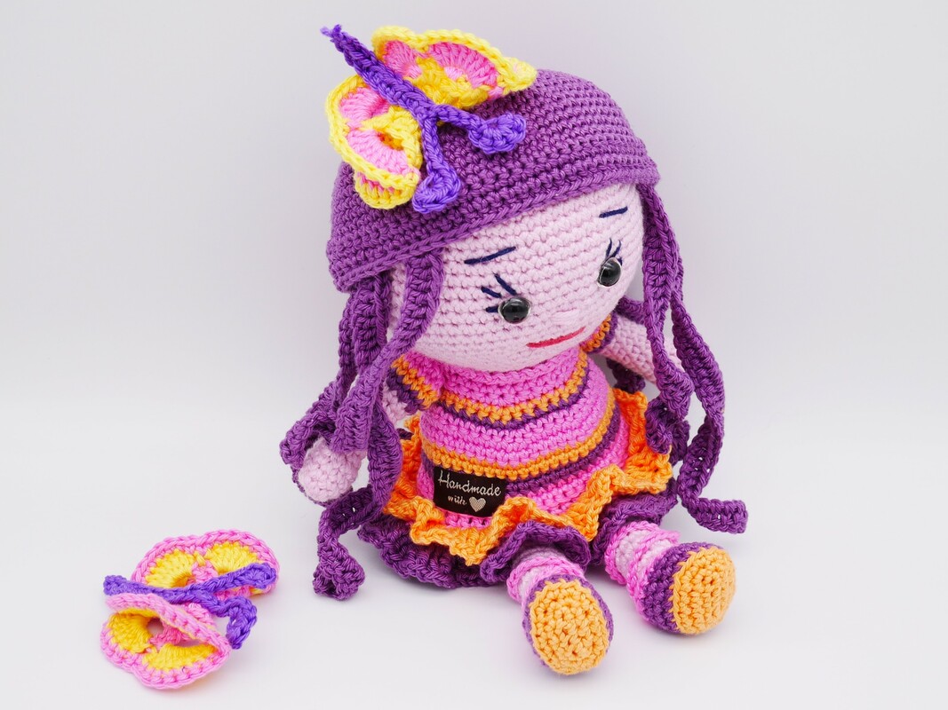 Püppchen Sarah, kann auch neu eingekleidet werden. Kleider, Schuhe, Haarpracht, Unterwäsche sind extra gearbeitet und können ausgezogen werden. Auch die Schmetterlinge sind in der Anleitung enthalten.
