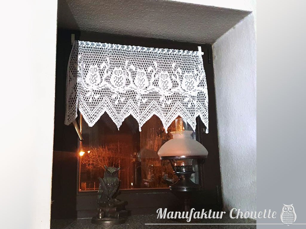 Mit dieser Gardine holst Du Dir die kleinen Eulen auch an die Fenster der Gartenlaube oder des Wohnwagens. Es gibt neben der Anleitung 4 komplett fertige Zählmuster für eine Breite über 5 Eulen und 4 Zählmuster mit Rapport, welchen Du selbst wählen kannst. Somit passt die Eulengardine an jede Fensterbreite. Du kannst folgenden Varianten wählen: