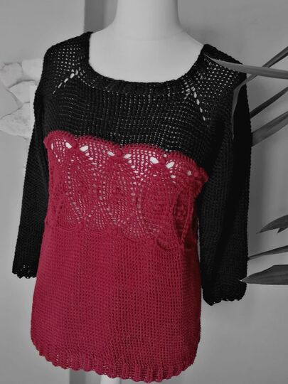 Luftmaschen, Kettmaschen, Stäbchen, Reliefstäbchen vorne und hinten,