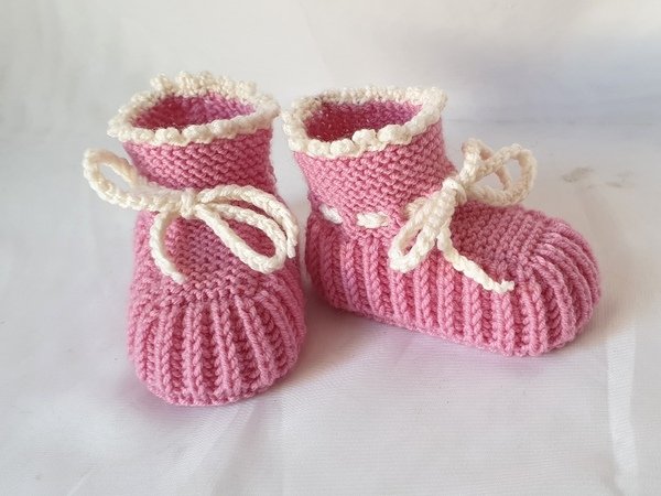 Ideal für alle, die mit dem Nadelspiel nicht vertraut sind, sind diese Baby-Schuhe, die mit 2 Nadeln gestrickt werden.