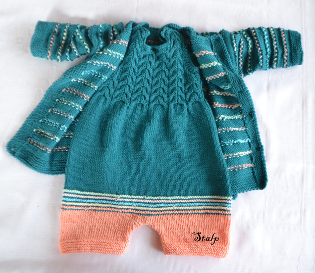 Strickanleitung für Jacke mit bunt gewebten Reihen. Die Jacke wird von oben als RVO in Reihen gestrickt, die Ärmel auf einem Nadelspiel.