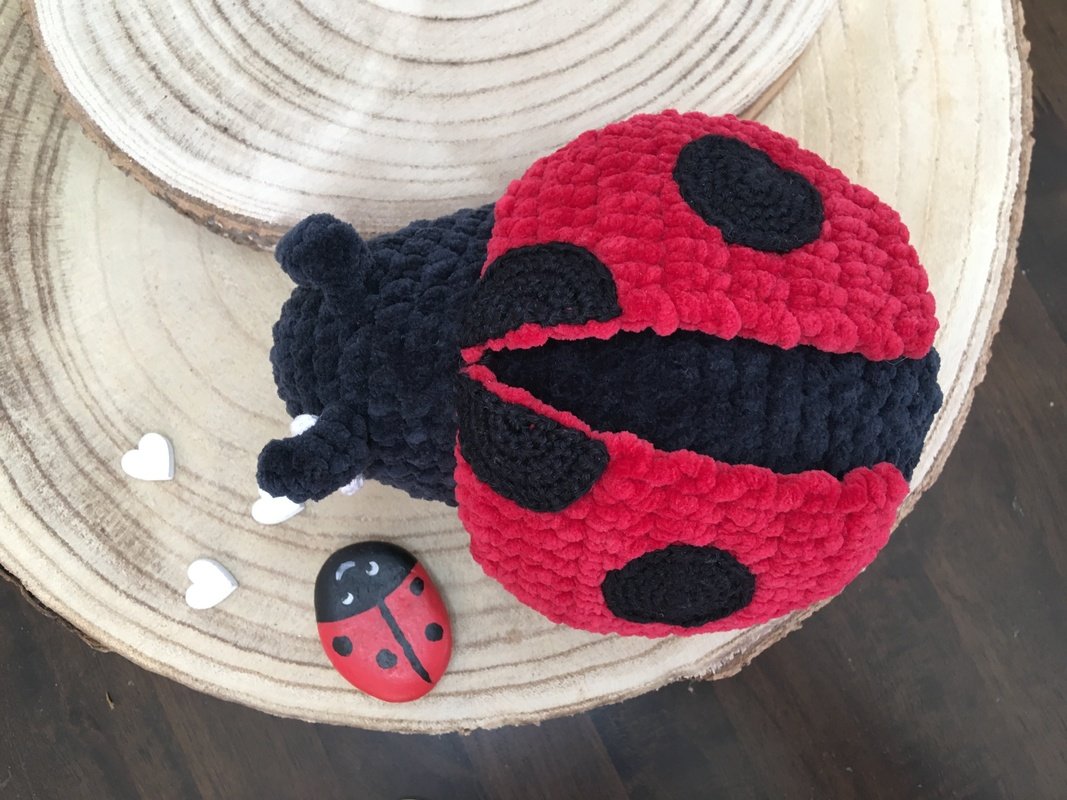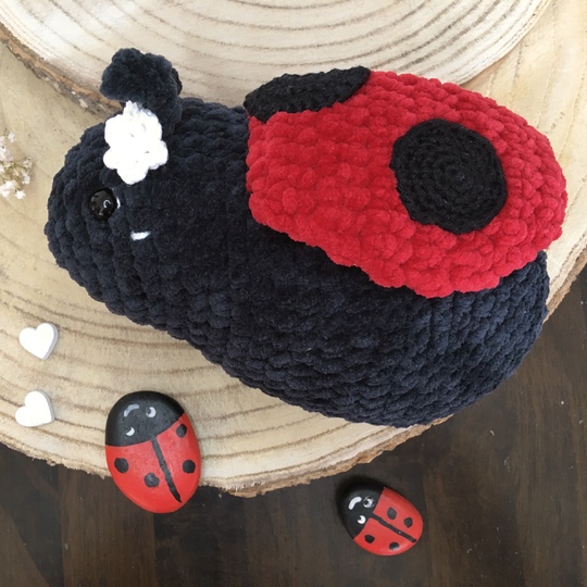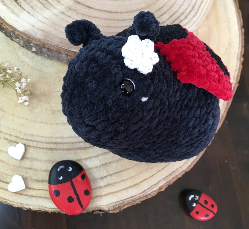 Der Marienkäfer Molly wird mit Häkelnadel 4 und Chenillegarn ca. 17cm groß.