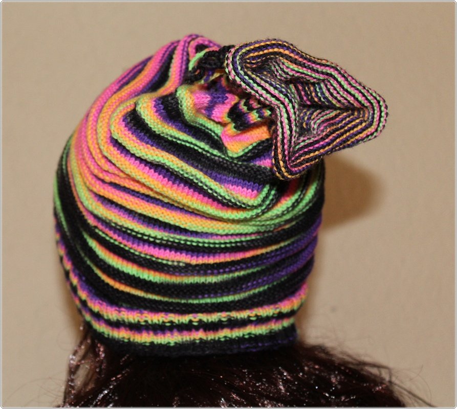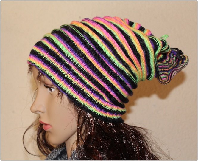 Mützen kann man eigentlich nie genug haben. Doch irgendwie hab ich nie eine gefunden, wo all meine Dreads rein passsen. Also musste ich mir was überlegen und so entstand diese schöne, farbenfrohe Variation, welche man nicht nur tragen kann wenn man Dreads hat. Deshalb durfte auch Marlene „Modell“ spielen und nicht ich. Hinten ist sie offen und durch zwei Lochreihen kann man variabel ein gehäkeltes Bändchen einfädeln, zuziehen und gut.