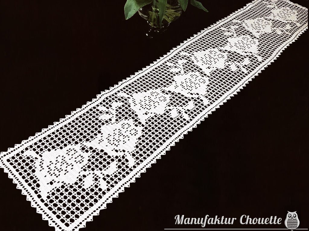 Für alle Eulenliebhaber gibt es auch ein Tischband in der Eulenkollektion. Das Tischband ist in der Länge variabel, Du kannst so viele Eulen häkeln, wie Du in der Länge brauchst. Der kleine Zackenrand erleichtert nicht nur das Spannen, er lässt das Tischband auch sehr zart wirken.