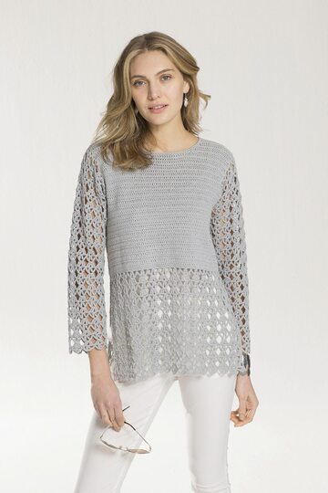 Ein schlicht in Stäbchen gehäkeltes Oberteil kombiniert mit einem ausdrucksstarken Spitzenmuster für das geschlitzte Schößchen und die Ärmel – fertig ist ein bezauberndes Häkelshirt!