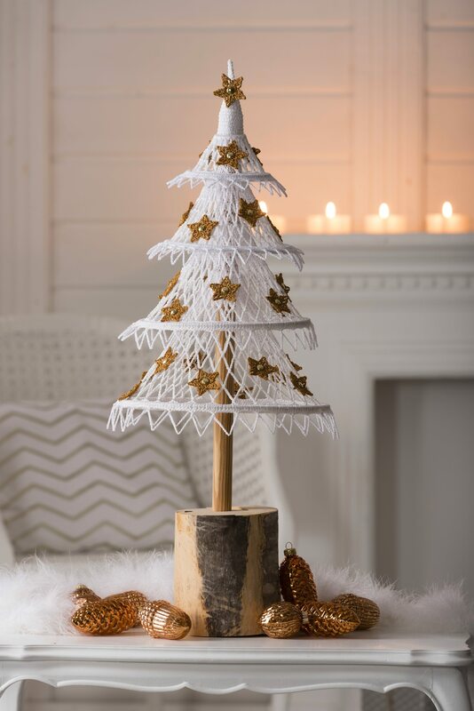 Gehäkelter Tannenbaum mit goldenen Häkelsternen