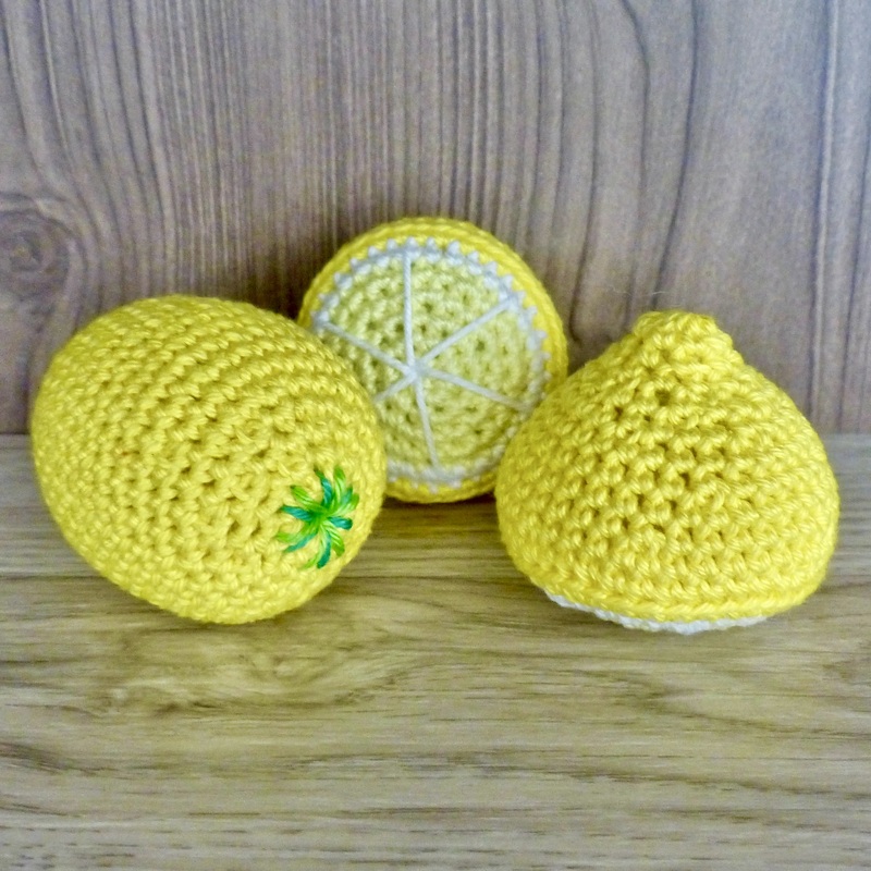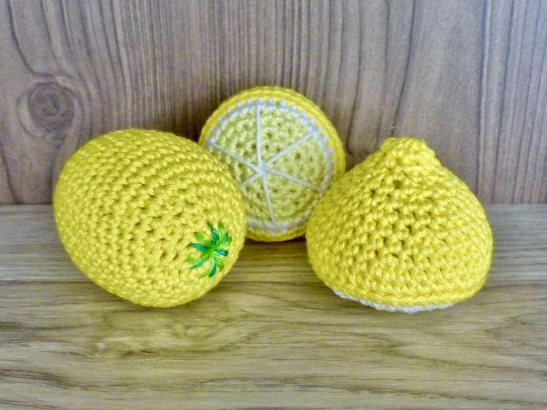 Mit dieser Häkelanleitung kannst Du eine ganze Zitrone, aber auch halbe Zitronen und Zitronenscheiben häkeln. Somit sind dem Einsatz in der Kinderküche und dem Kaufmannsladen (fast) keine Grenzen gesetzt. Gleichzeitig kannst Du damit auch eine prima sommerliche Deko beispielsweise in einer Obstschale gestalten.