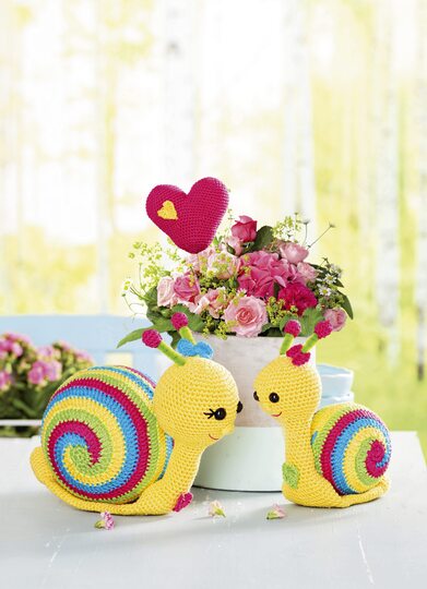Häkel dieses fröhliche Schneckenduo, bestehend aus Mami und Kind. Besoders an den beiden ist das Spiralmuster ihrer Häuschens, was sie zu echten Powerschnecken macht. Sind sind garantiert nicht gefräßig, sondern eine fröhliche Deko für jeden Haushalt.
