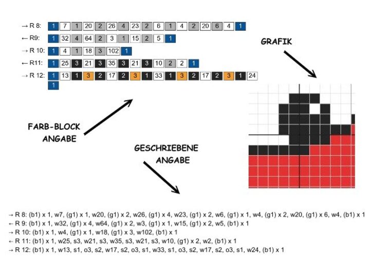 -farbige Zahlen-Blöcke für jede Reihe für feste Maschen (Stb od. hStb)