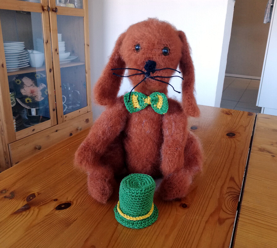 Die Fliege ist nur umgebunden und kann abgenommen werden. Hut und Möhre sind auch nicht angenäht.