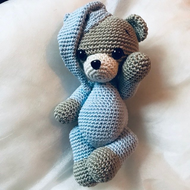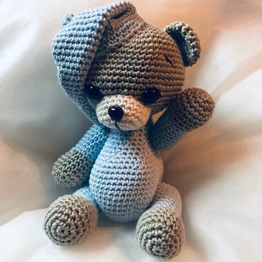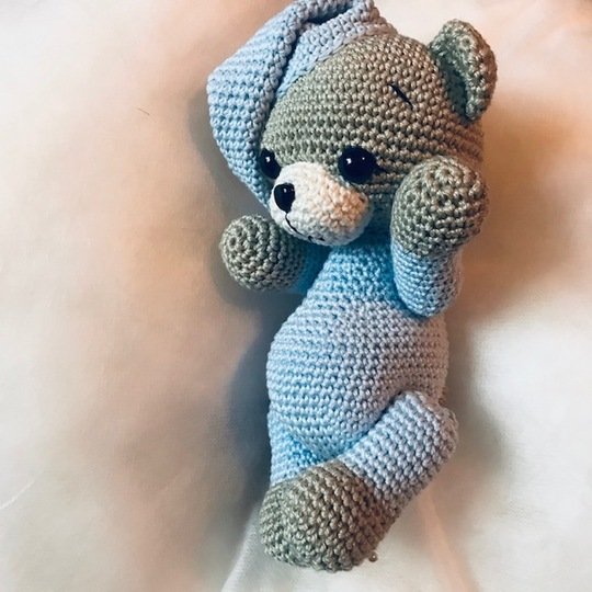 Häkelanleitung für einen niedlichen Teddybären mit Schlafmütze und beweglichen Gliedmaßen. 11 Seiten, detaillierte Schritt-für-Schritt-Beschreibung mit vielen Bildern.