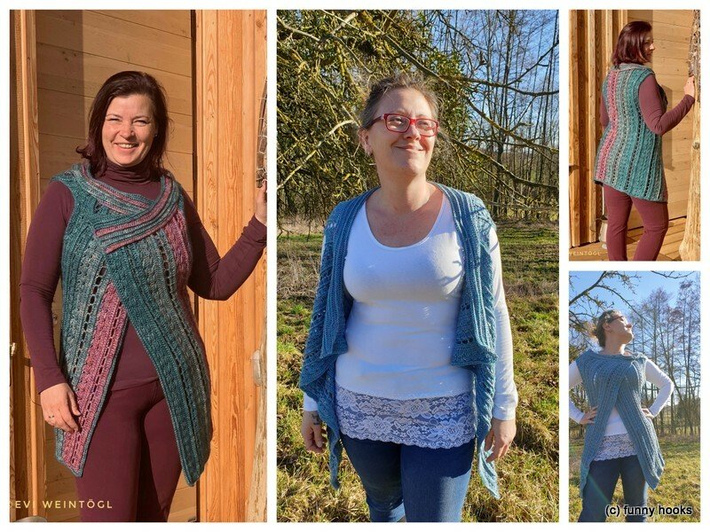 "Nebo" ist eine luftig, leichte Jacke, die durch die asymmetrische Form zum echten Hingucker wird. Die Jacke ist auch in symmetrischer Form machbar und ebenfalls in der Anleitung beschrieben.