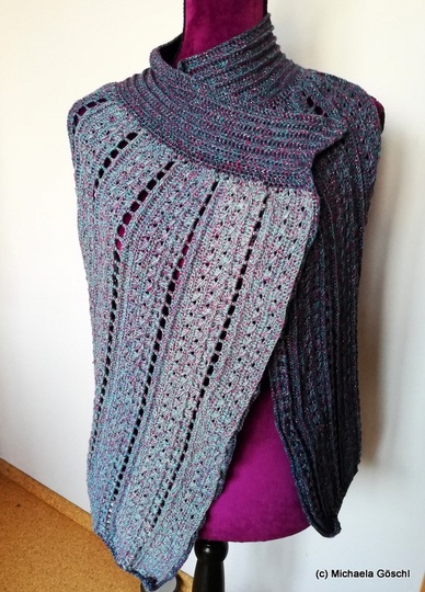 Ich habe für meine Version in Gr. 40/42, 2000 m, 4 fädig, Wunschwicklung von Rennratterl's bunte Wollwunderwelt mit einer NS 3,5 mm verabeitet. Dies ergab eine Länge von Hals bis Unterkante von 92 cm und eine Breite 123 cm.