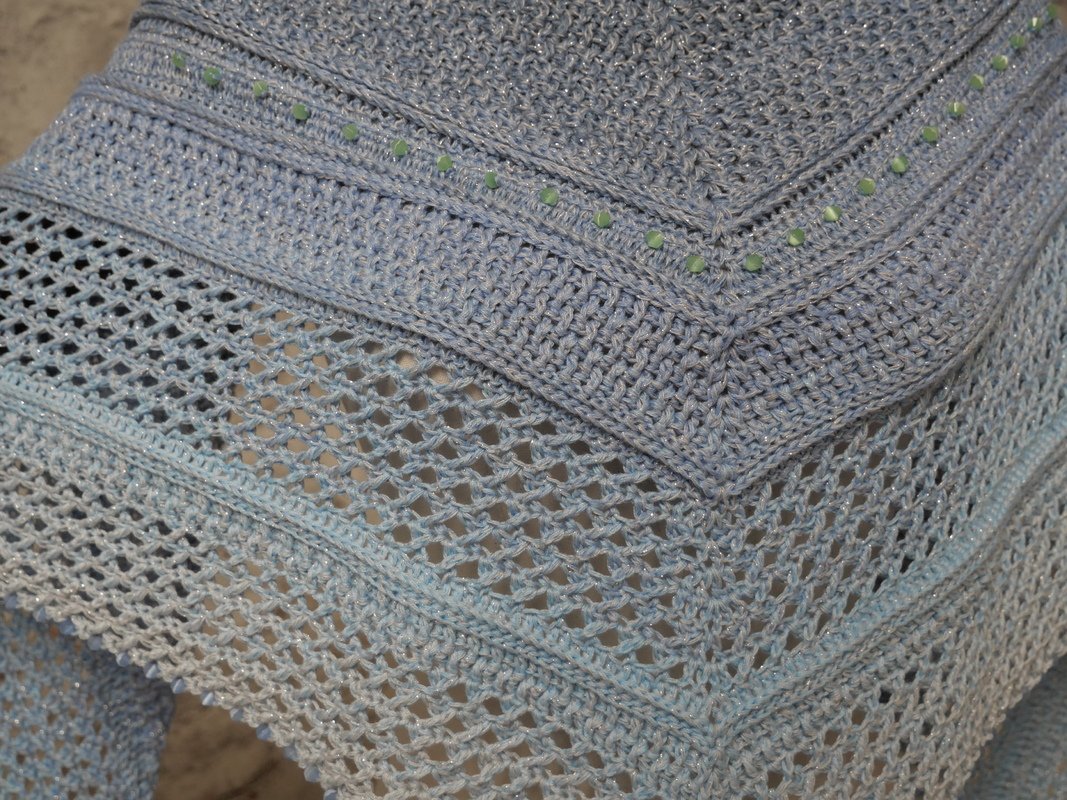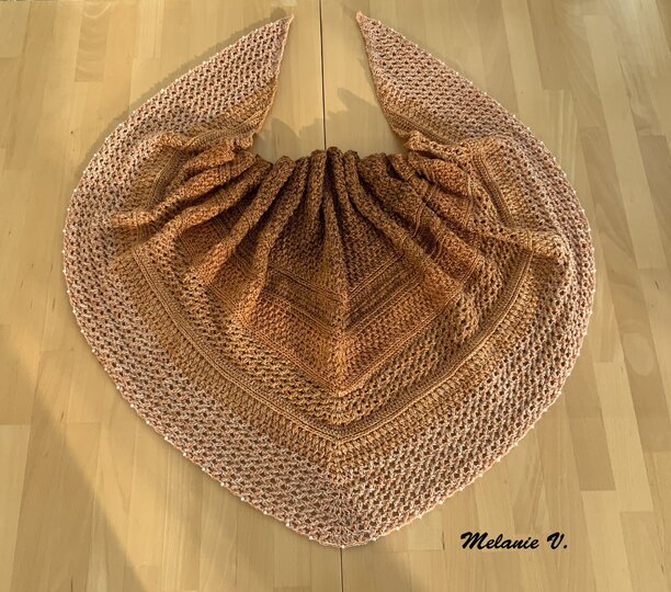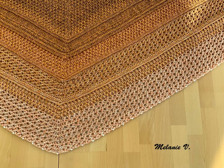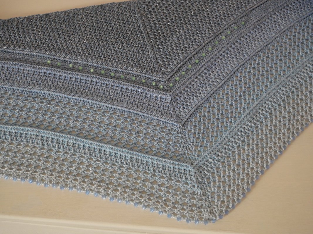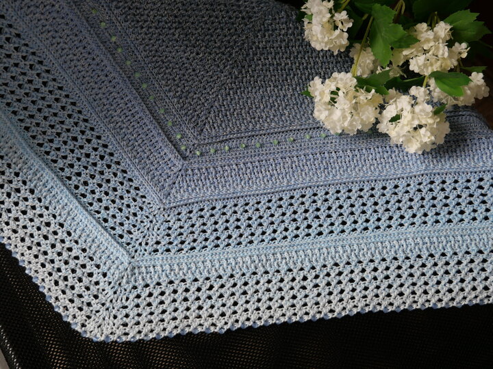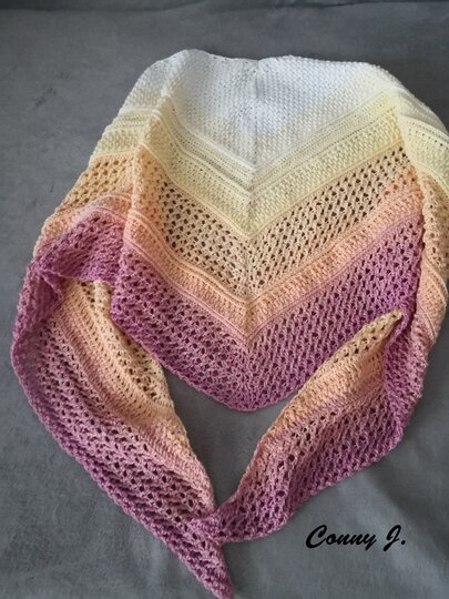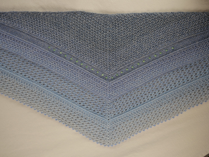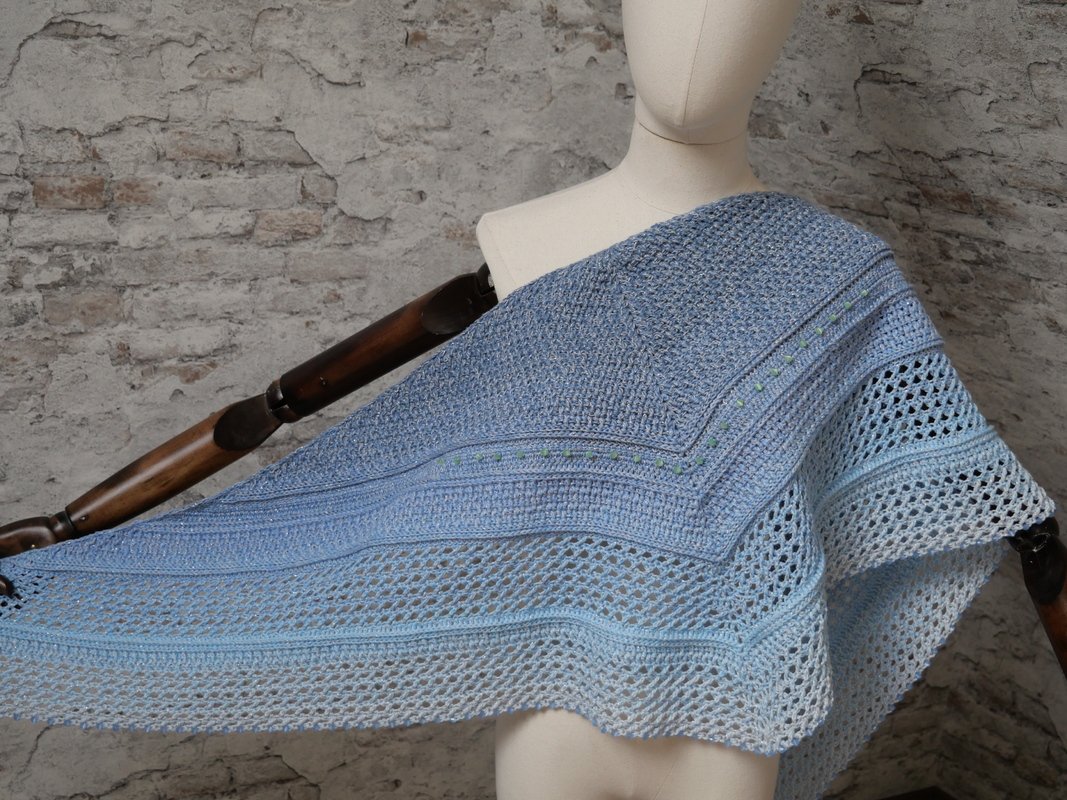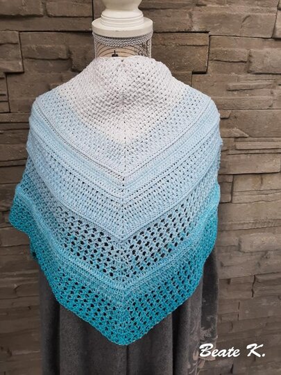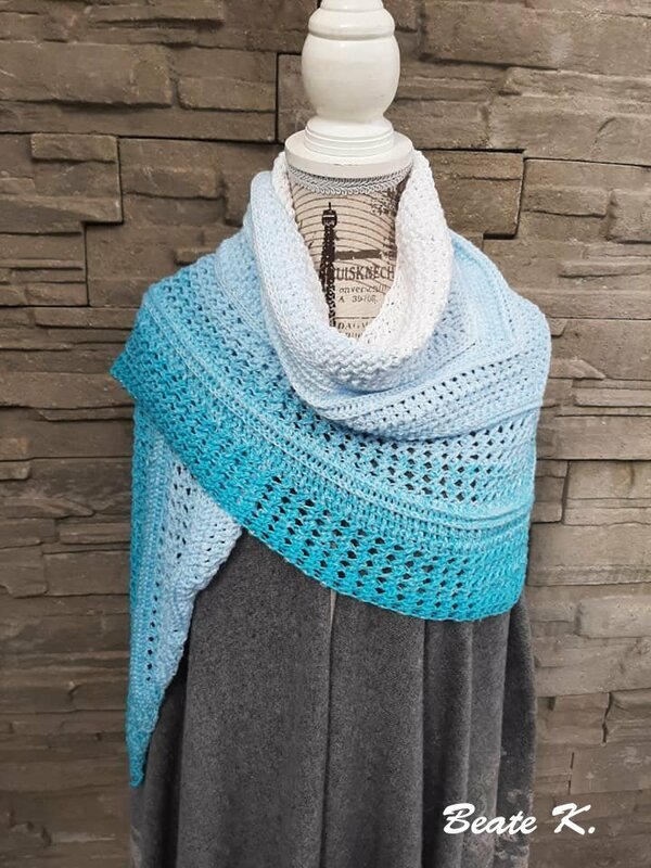 Mein Tuch "Catalina" ist bestens geeignet für die Übergangszeiten. Im Schulterbereich ist das Muster dichter, nach unten hin wird es luftiger. Die einzelnen Musterabschnitte lassen sich leicht verkleinern oder vergrößern, so dass das Tuch in seiner Größe variabel gestaltet werden kann.