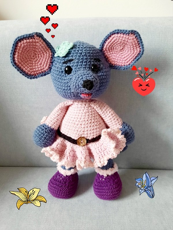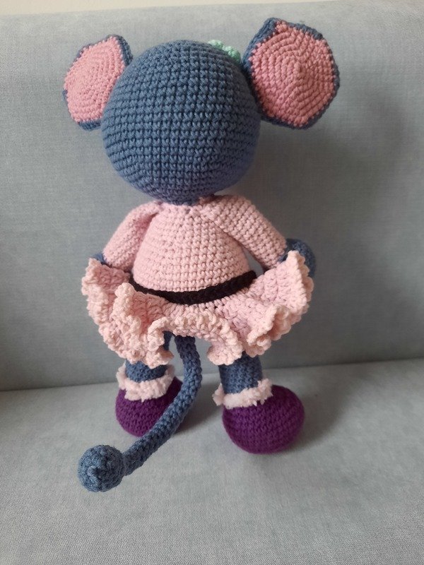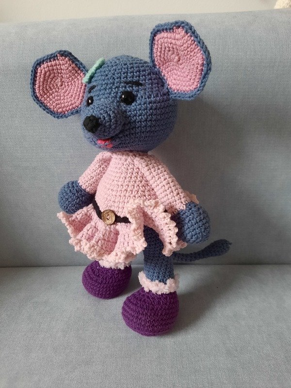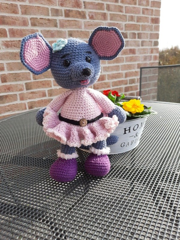 Die Maus ist ca. 30 cm groß. Die Größe kann aber je nach verwendetem Garn variieren