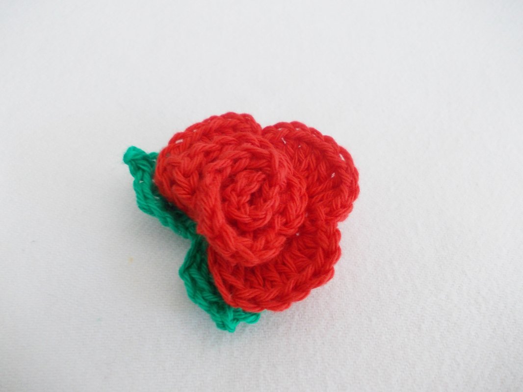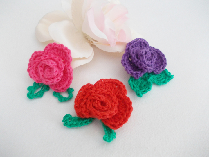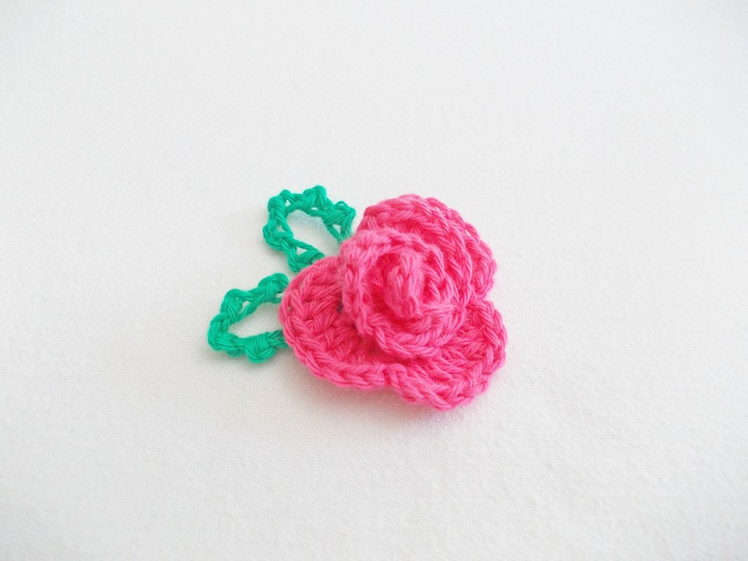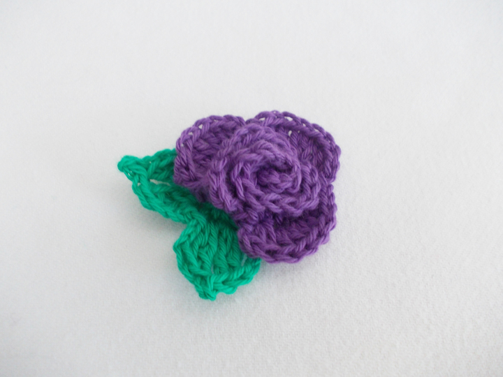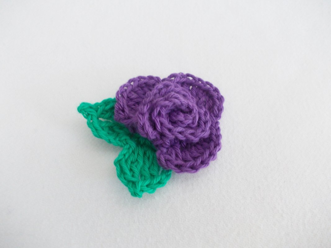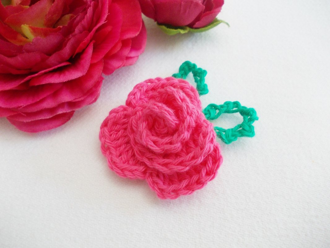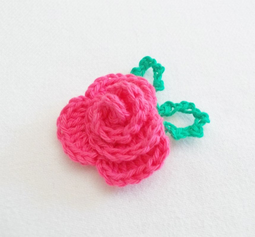 Eine Häkelrose mit 3 verschiedenen Blättern, schnell gehäkelt und dennoch fein. Tragbar als Brosche, als Haarclip, Blumenclip oder wie auf den Bildern als Streudeko oder Aufnäher.