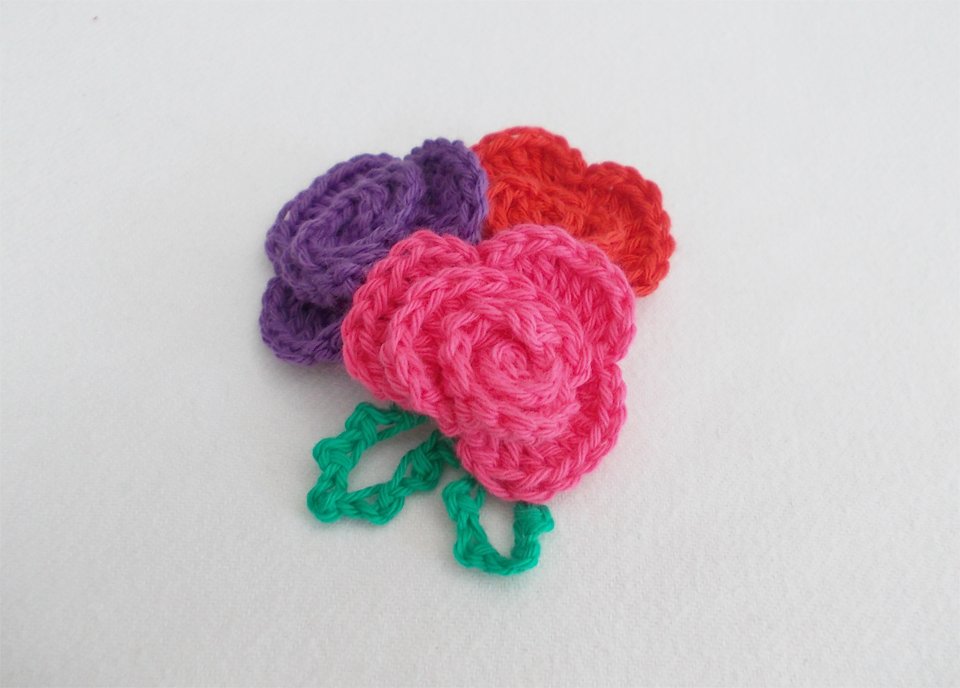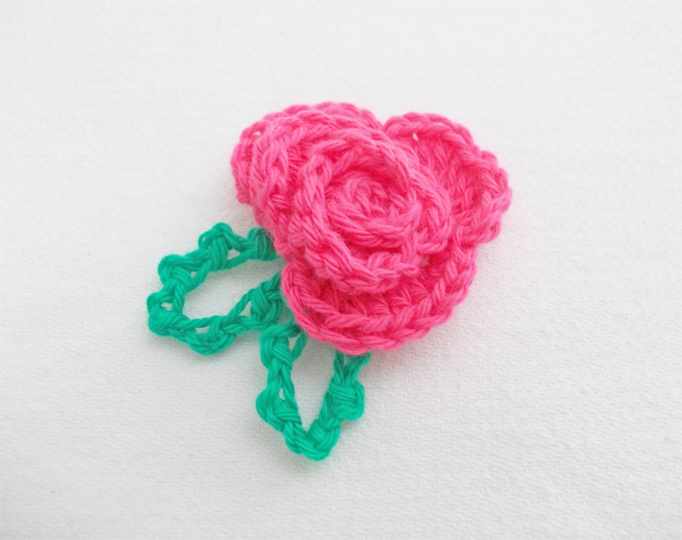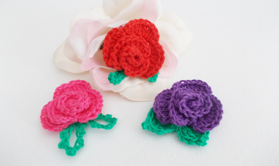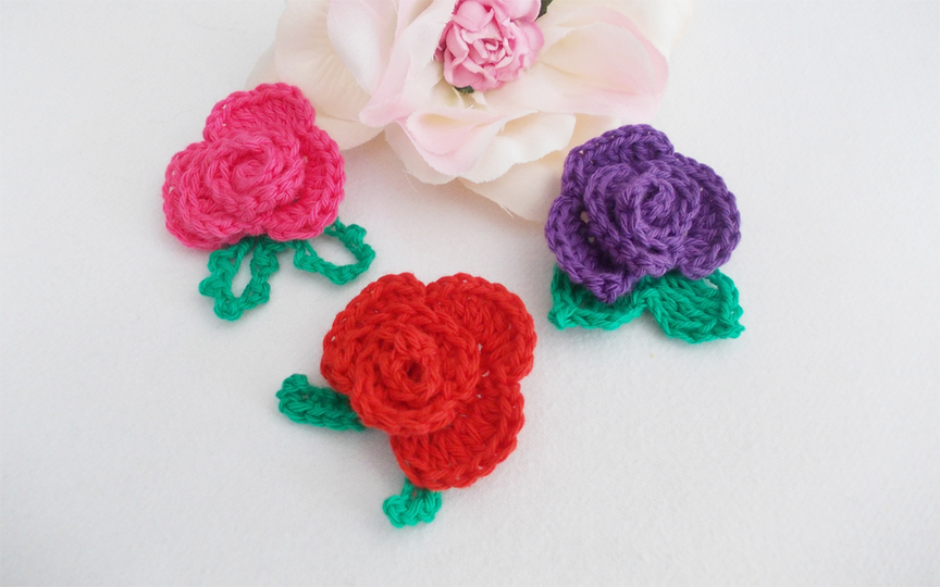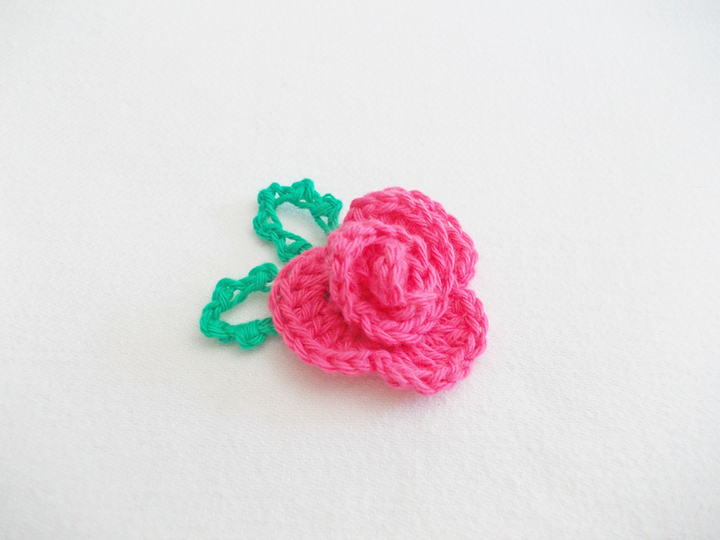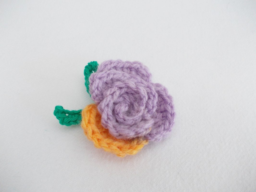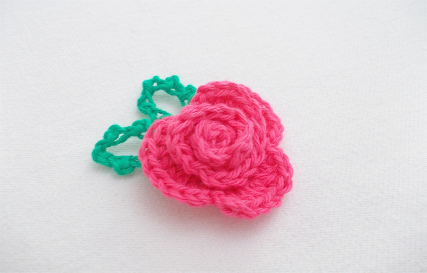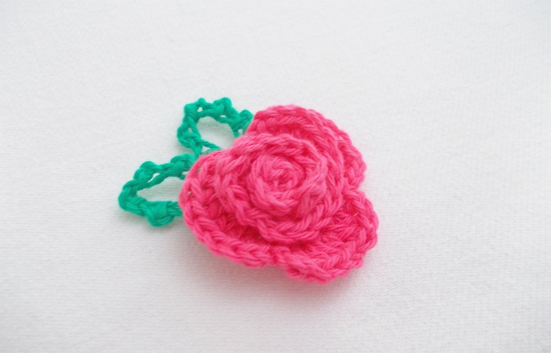 Eine Häkelrose mit 3 verschiedenen Blättern, schnell gehäkelt und dennoch fein. Tragbar als Brosche, als Haarclip, Blumenclip oder wie auf den Bildern als Streudeko oder Aufnäher.