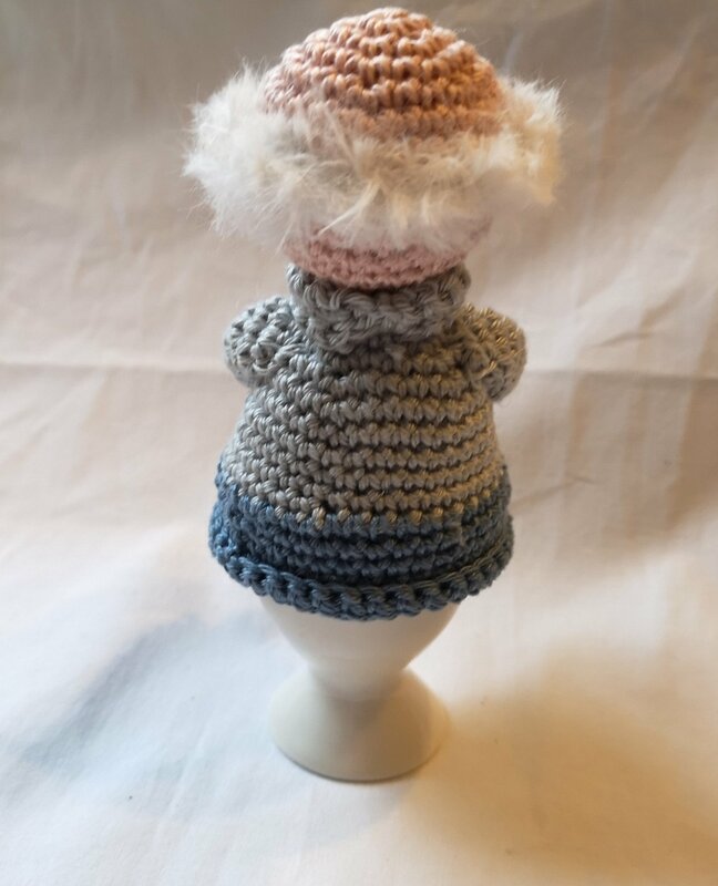 Bei Verwendung der genannten Materialien wird der Eierwärmer Opa Willi ca. 11 cm hoch und passt über ein herkömmliches Hühnerei.
