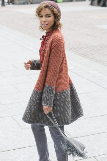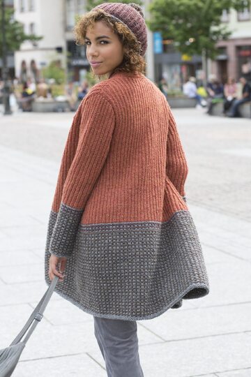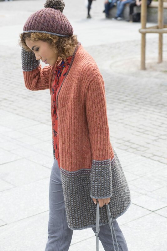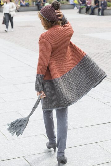 Für Mantel und Mütze 350 (400) 450 g Kupfer (Fb 0075), 200 (250) 250 g Grau (Fb 0003), 150 (150) 200 g Braun (Fb 0068) und 50 g Weinrot (Fb 0080) „Mila” (90% Schurwolle, 10% Polyamid, LL = 150 m/50 g) von LANG YARNS