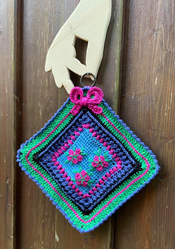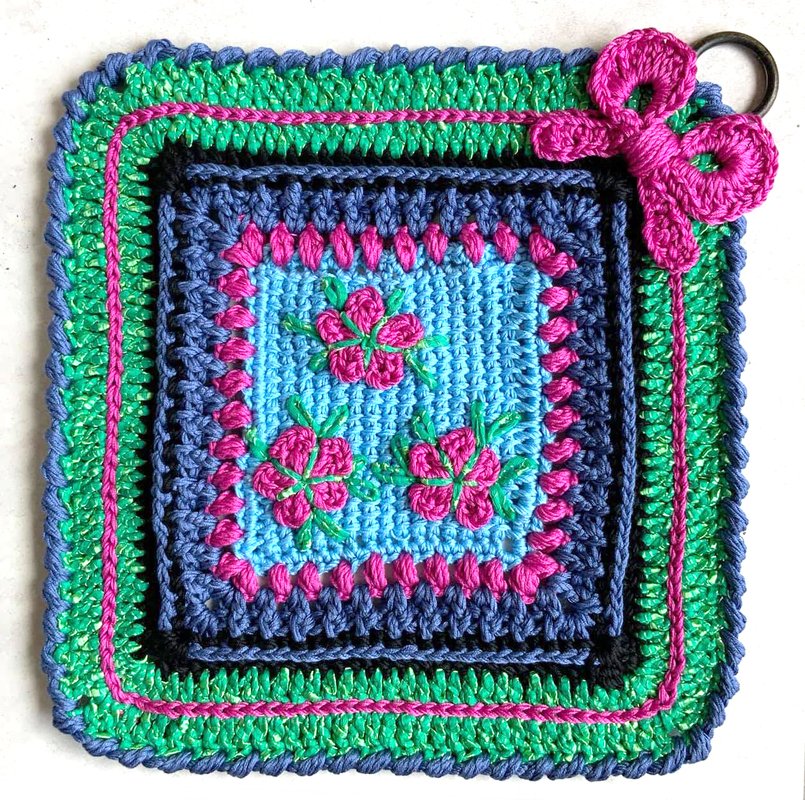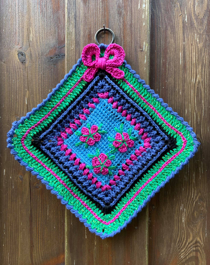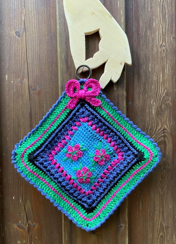 Der fertige Topflappen Summergroove eine Seitenlänge von 25 cm + wiegt 84 Gramm