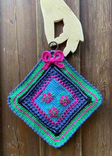 Der Topflappen Summergroove ist ein erfreulicher Blickfang in Deiner Küche..und sieht auch schön aus, wenn er nur an der Wand hängt..der türkise Teil wird hier tunesisch gehäkelt..ich zeige Dir mit einigen Fotos wie das geht (ist ganz einfach) und habe auch noch ein Erklär-Video verlinkt...aber wenn Du es vorher schon kannst..ist es natürlich besser