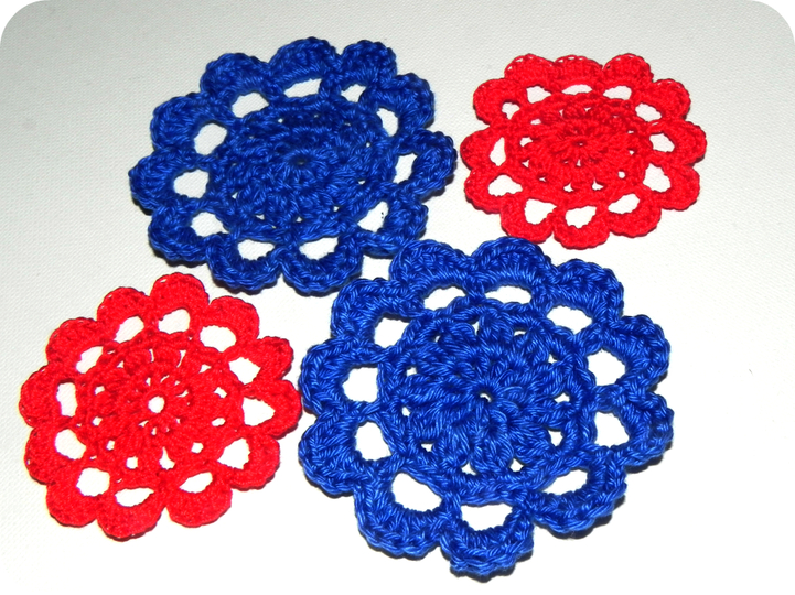 Material: Häkelgarn (meine Empfehlung: 100% Baumwolle mercerisiert gasiert 125m / 50gr, z.B Shachenmayr Catania, aber gerne auch andere oder verschiedene Wollreste), Häkelnadel Nr. ca. 2 bis 3,5, oder auch andere (je größer die Nadel ist, desto größer wird auch die Blume sein), Schere, Wollnadel