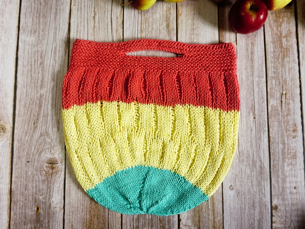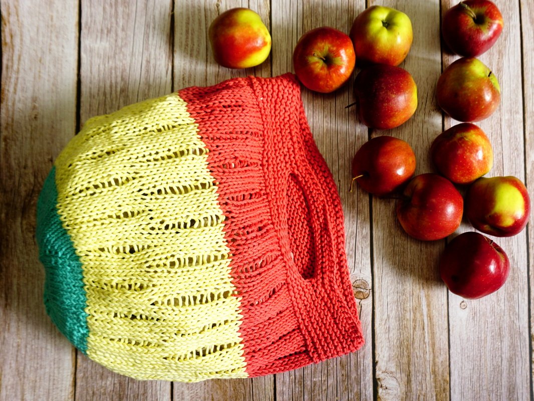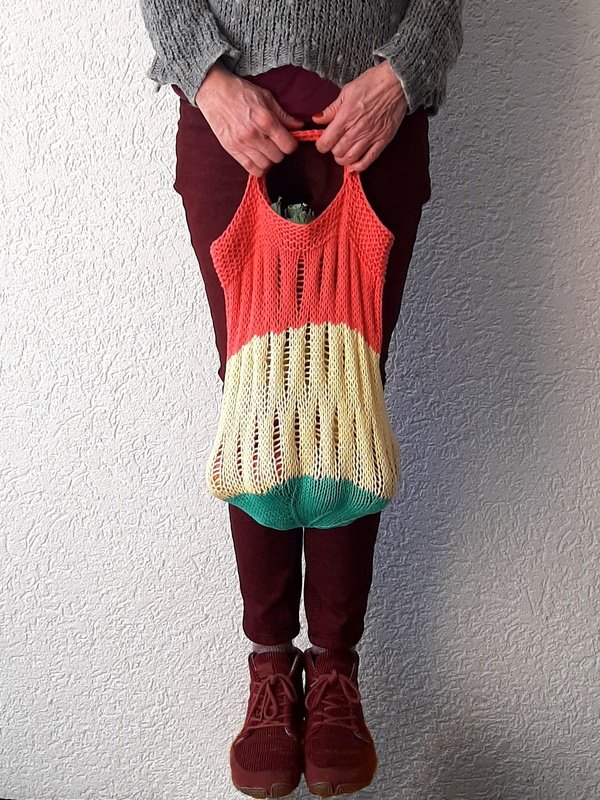 Diese sehr schöne Einkaufstasche ist schnell gestrickt. Die Tasche wird von oben nach unten, in Runden, gestrickt und der Griff wird direkt mit eingearbeitet. Der Mittelteil besteht aus einem schönen Muster mit Luftlöchern die nicht zu groß sind. So ist die Tasche, trotz ihrem hohen Fassungsvermögen, zusammengefaltet recht klein und passt gut in die Handtasche. Am Boden machen wir Abnahmen und ziehen am Ende die restlichen Maschen zusammen. Das Muster lässt sich auch sehr schön für andere Projekte einsetzen.